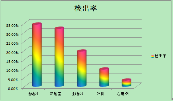 其中检验科占34.3%,彩超室占32%,影像科占19.4%,妇科占9.5%,心电图占3.4%。