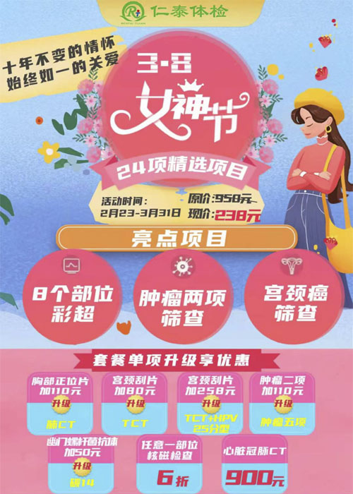 今年恰逢集团公司“三八女神节”活动开展十周年,为了该项活动能够充满活力,焕发生机,各体检部特推出以“十年不变的情怀、始终如一的关爱”为主题的惠民健康体检活动。体检套餐包含:8部位彩超、肿瘤筛查、妇科疾病筛查等多项检查。