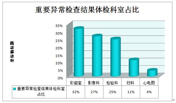 彩超室占32%、影像科占27%、检验科占25%、妇科占11%、心电图占4%。
