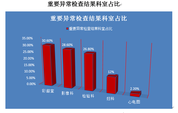 彩超室占30.6%、影像科占28.6%、检验科占26.8%、妇科占12%、心电图占2.2%。